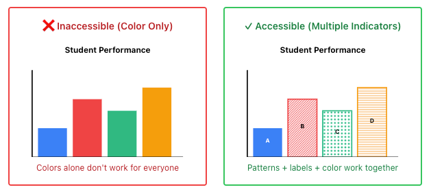 Never use colour as the only means of conveying information. This includes charts, graphs, or highlighting important information. To improve accessibility, use patterns and high contrast colours in graphs, or include text labels and symbols to indicate highlighted information.